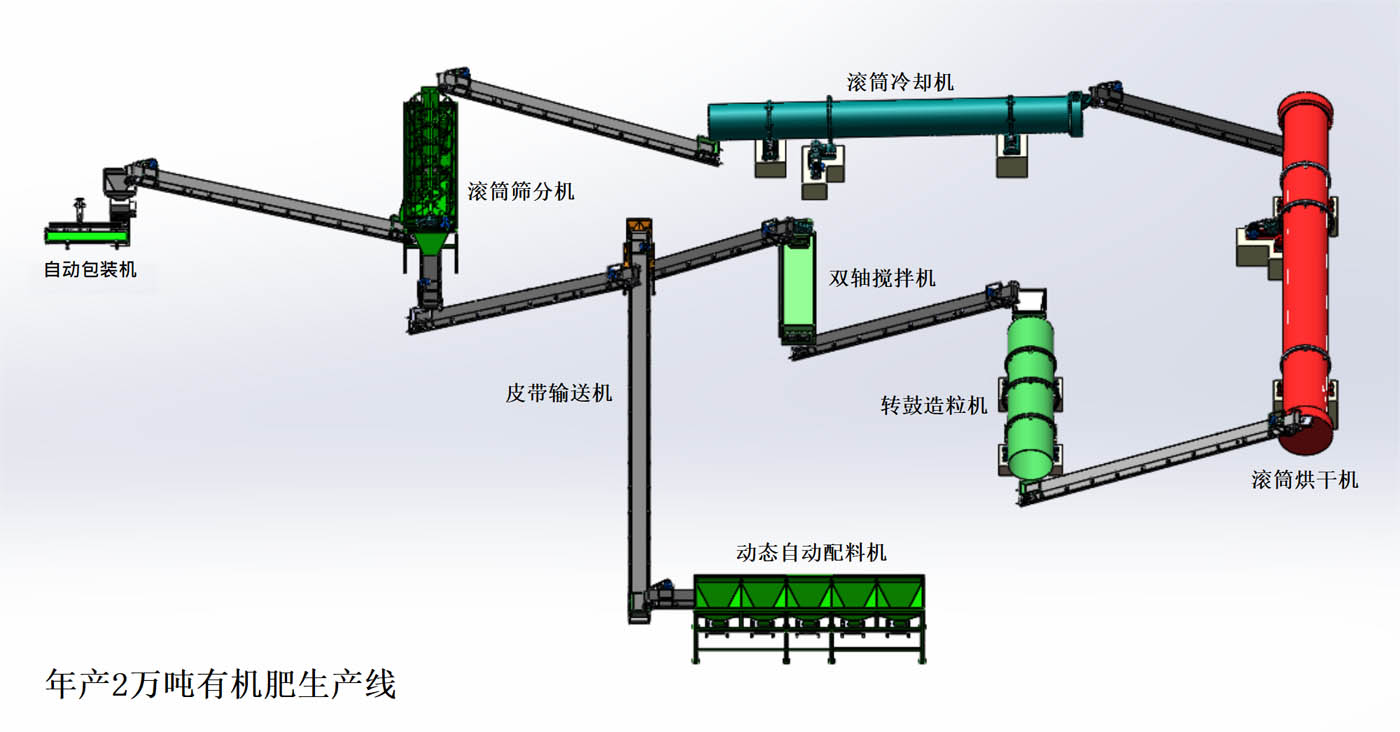 年產(chǎn)2萬(wàn)噸有機(jī)肥生產(chǎn)線一般分為預(yù)處理和造粒兩大部分。
