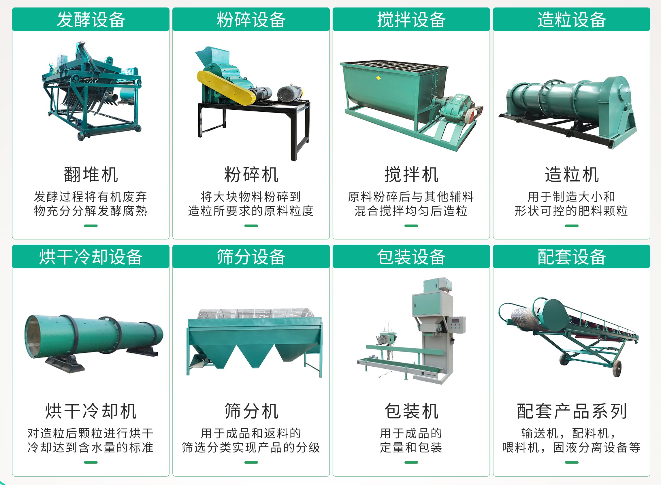有機(jī)肥生產(chǎn)設(shè)備一般包含 : 發(fā)酵設(shè)備、攪拌設(shè)備、粉碎設(shè)備、造粒設(shè)備、烘干設(shè)備、冷卻設(shè)備、肥料篩分設(shè)備